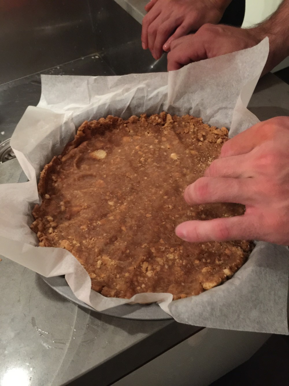 Crush the Graham crackers and put them into a mixing bowl. Melt peanut butter in a microwave oven for about 2 minutes and then add it to the crackers. Mix them together and spread the mixture on a pie tray lined with baking paper.