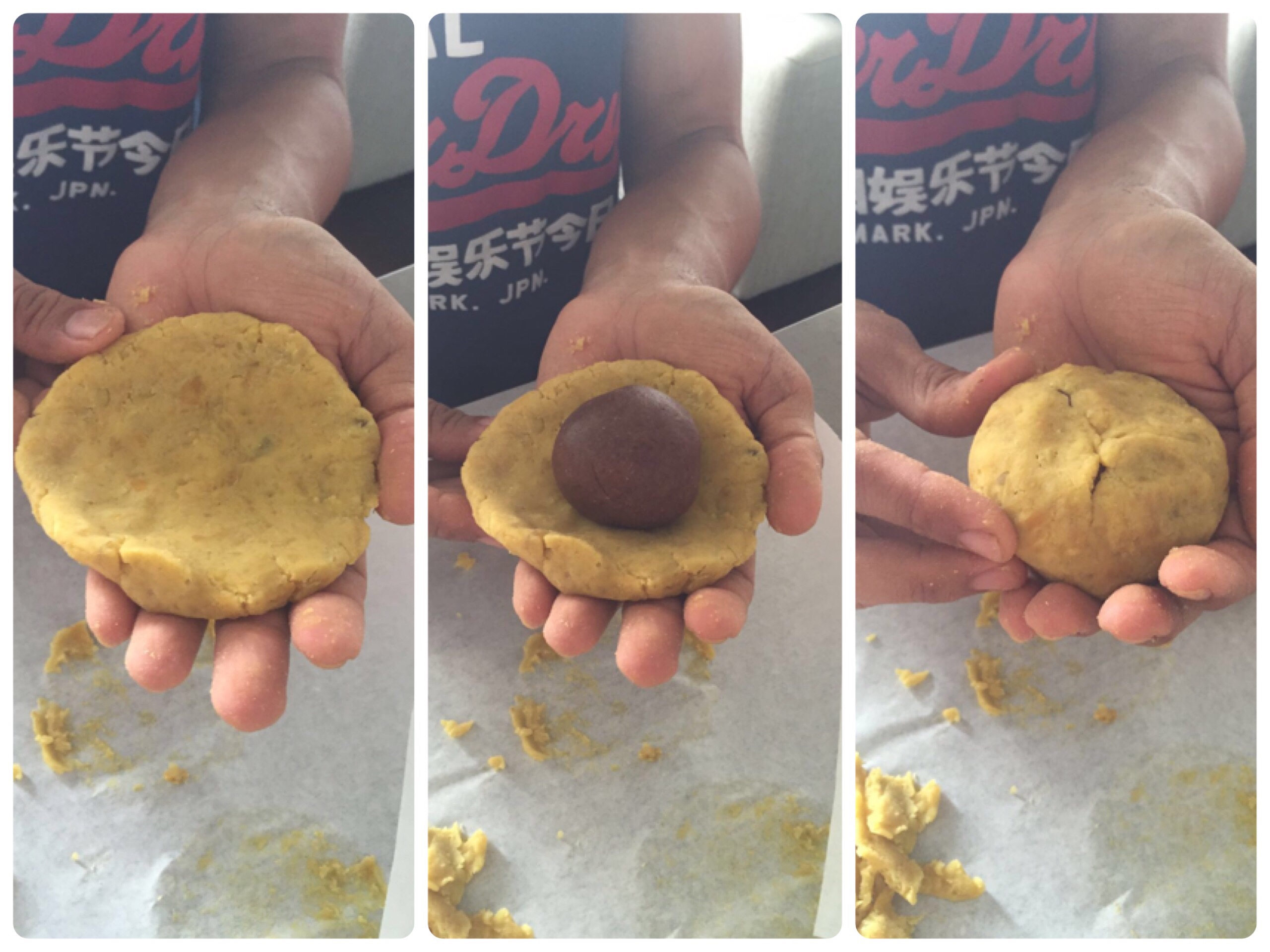 I roll the filling paste into balls and put them into the sweet potato dough.